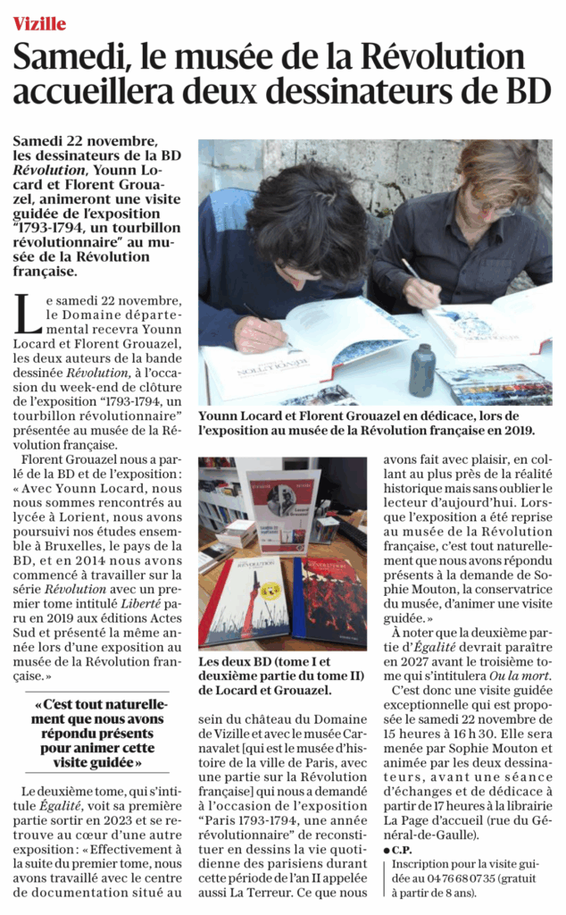 Musée de la Révolution & Librairie Marion Lely 626 Views Partager Le Dauphiné Libéré annonce la venue de Florent Grouazel & Younn Locard au Musée de la Révolution de Vizille, puis à la librairie. Article Dauphiné Libéré